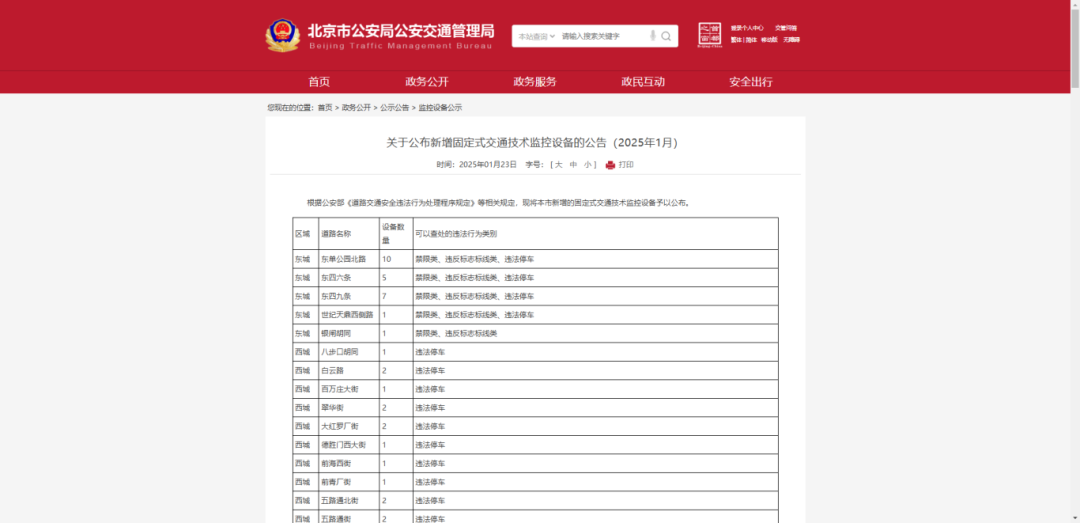 2025年1月23日,北京市公安交管部门发布公告,公布了一批固定式交通技术监控设备。此次,北京150处道路新增了671个电子警察,重点监测禁限类、违反标志标线类、超速、货车右转必停、闯红灯、不礼让斑马线、违法停车、驾车不系安全带、驾车接打电话等违法行为。